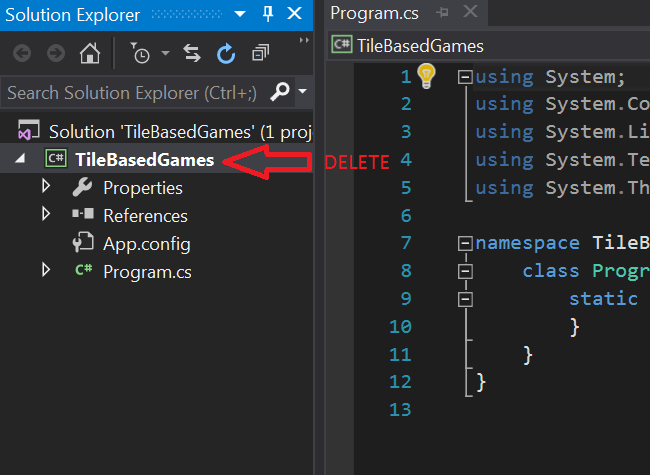Notice that this created a new solution called TileBasedGames as well as a new project called TileBasedGames. Go ahead and delete the project. Right click the project and select Remove. Click "OK" on the confirm dialog.